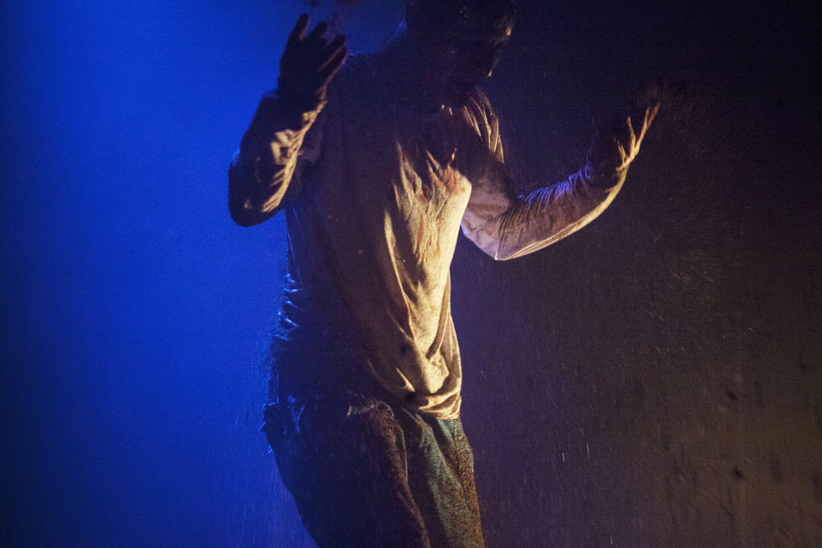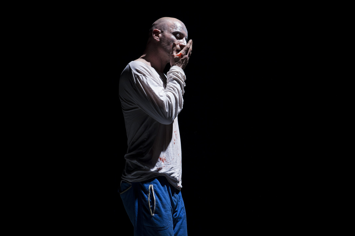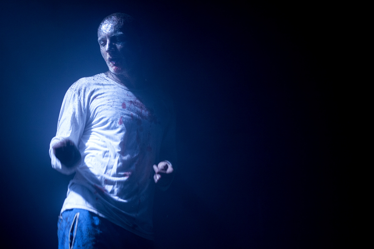 «Museum» invece mette in scena il racconto più freddo, l’arrestarsi della corsa, la cristallizzazione. Riferimento a una società musealizzata dove non c’è più spazio nemmeno per la fuga. Come i colori dominanti nei primi due lavori erano rispettivamente il bianco e il rosso, qui ci troviamo immersi nel blu – colore della malinconia secondo la lingua inglese, colore del raffreddamento che prelude la perdita definitiva di calore. In questa cornice Roberto Latini veste maschere dolorose: la prima indossa un cappotto cosparso di chiavi e possiede una faccia metallica; la seconda porta una semplice maglietta bianca che si macchia di sangue, ultima traccia di una vitalità irredenta che pure sembra tendere all’esaurimento. Non a caso queste maschere, nonostante il panorama di desolazione, continuano a mormorare invocazioni all’amore, quasi assistessimo – attraverso brani originali e citazioni shakespeariane – al rantolo dell’ultimo dei romantici.